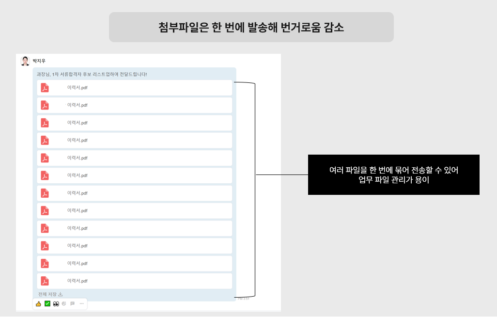 특히, 잔디처럼 토픽을 생성하는 구조가 없다 보니 소통에 제한이 생겼습니다. 이외에도 멘션 기능이 없어 원활한 업무 할당이 안 되고, 검색 기능이 없어 자료를 하나하나 찾아야 한다는 점, 첨부파일을 묶어 보내는 것이 불가한 점 등 기본적인 업무 처리에 대한 피로도를 느끼게 되었어요.
