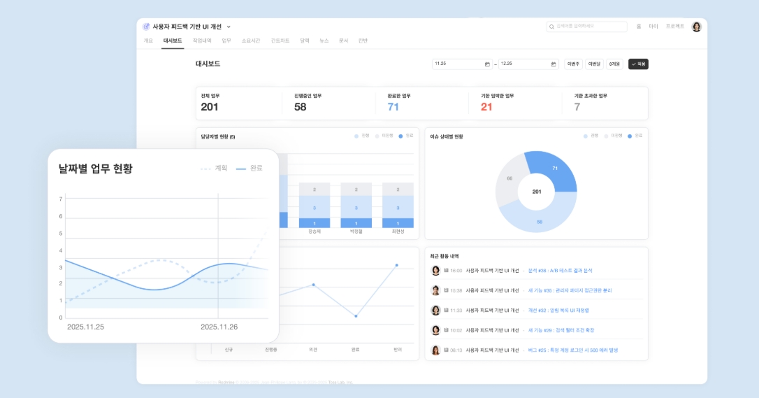 로드맵 기능을 사용하면 프로젝트 전체 일정을 한눈에 파악할 수 있어, 휴가 계획과 업무 일정을 효율적으로 조율할 수 있습니다.