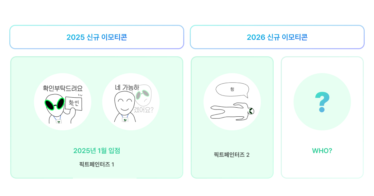 2025년에는 지금껏 잔디에서 보지 못했던 MZ형 비즈니스 이모티콘인 ‘더픽트’의 픽트페인터즈가 신규 입점했었습니다. 잔디의 소중한 고객사인 더픽트는 잔디 안에서 사내 이모티콘을 적극 활용하고 싶어 이미지 파일 형태로 소통하다가 잔디에 정식 입점을 진행하게 된 케이스인데요. MZ형 이모티콘을 기대보다 더 많은 잔디 유저 분들이 활용해 주셔서 압도적으로 높은 사용량을 기록했어요. 더픽트에서는 작년에 제작된 픽트페인터즈 이모티콘에 더해 더 많은 이모티콘을 직접 제작하여 활용하고 계시는데요. 2026년 올해에도 마찬가지로 많은 관심과 사랑을 받을 것으로 기대되는 ‘픽트페인터즈 2’가 정식 입점할 예정입니다. 🥳