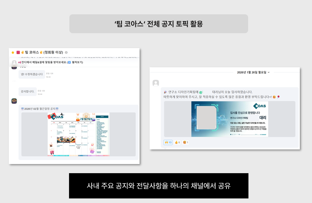 현재 코아스에는 20개 이상의 토픽이 활성화되어 있으며, 프로젝트와 TF 단위로 체계화해 운영하고 있습니다. 대표님부터 신입사원까지 전 구성원이 참여하는 팀 코아스 전체 토픽에서는 중요한 공지사항을 공유하기도 하고, 회의 중 회의 중 발생하는 이슈는 즉시 할 일로 배정하고 실행까지 연결됩니다. 누가 아직 확인하지 않았는지 직관적으로 파악할 수 있어 부서 간 협업은 물론, 의사결정 속도가 눈에 띄게 개선되었어요.