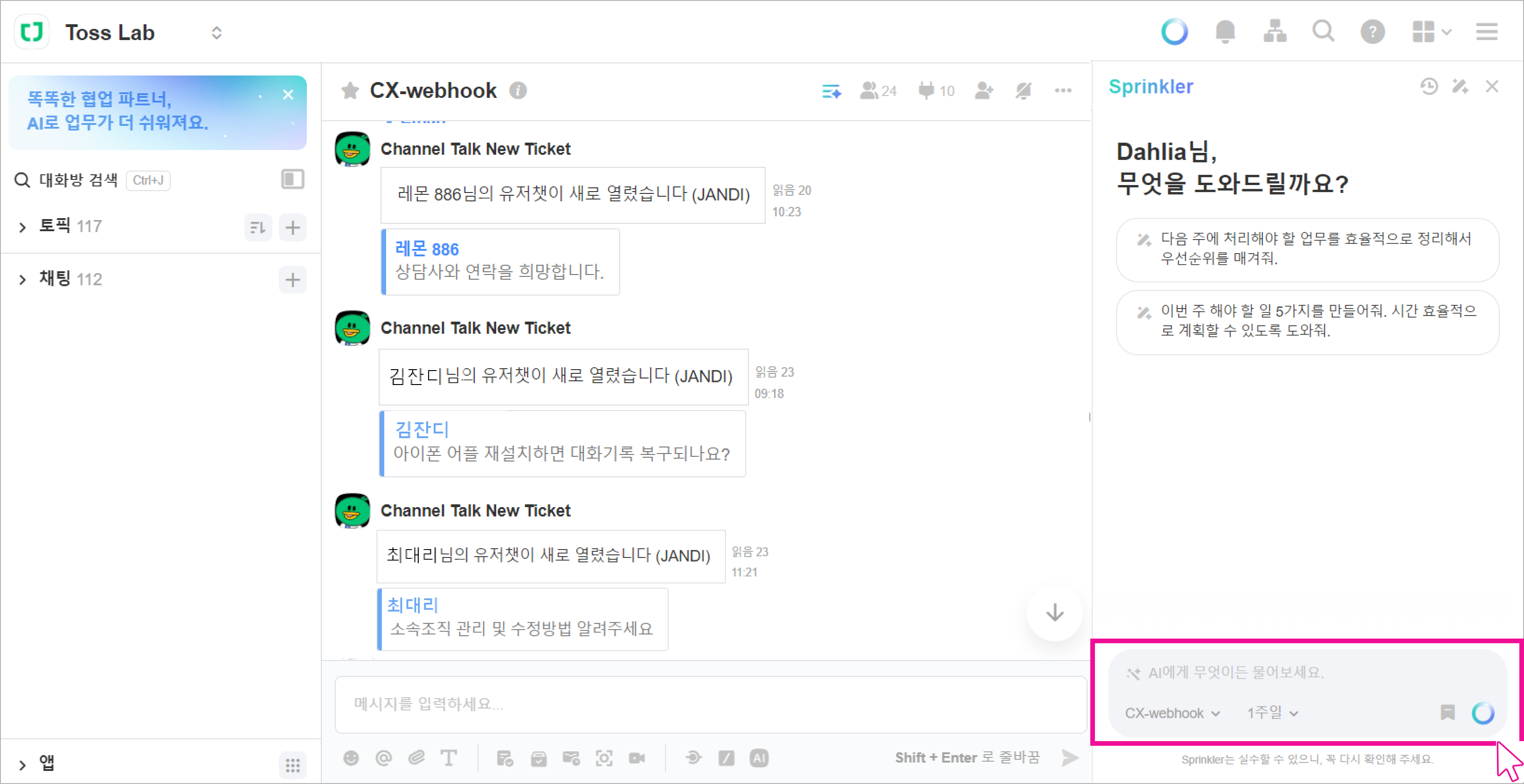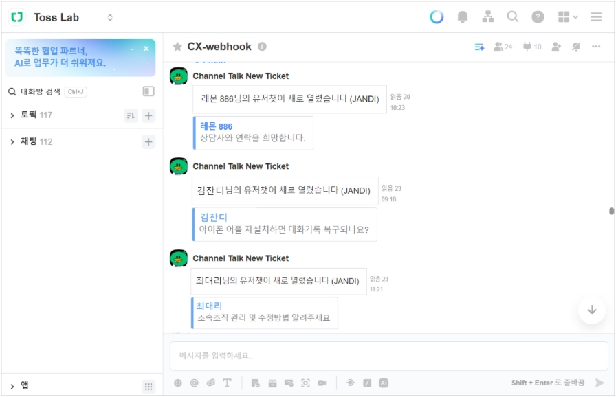잔디 팀은 문의 건을 빠르게 처리하기 위해서 1개의 토픽에 VoC 알림을 받고 있습니다.