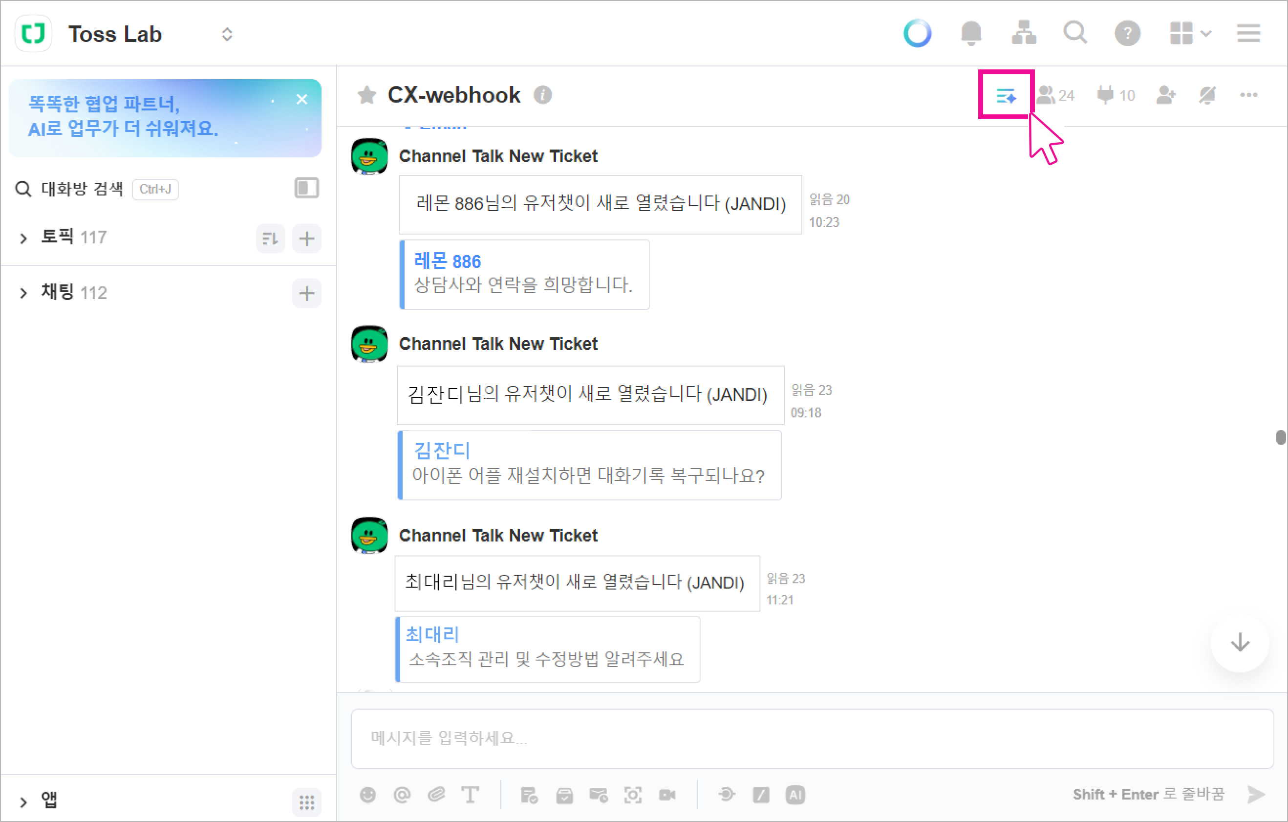 👉[잔디 커넥트] 채널톡 고객문의 잔디로 받아보기