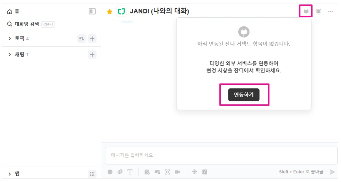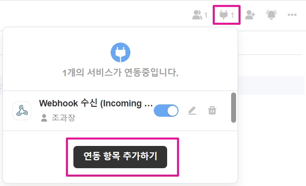 4-1) 봇을 연동할 토픽 우측 상단에 플러그 모양 [잔디 커넥트] – [연동 항목 추가하기]를 클릭해 주세요.