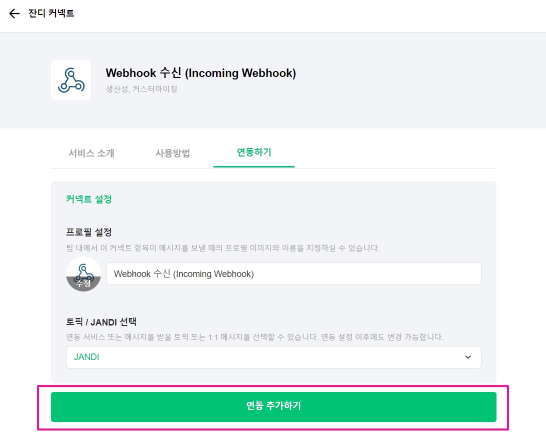 1-2) [Webhook 수신 (Incoming Webhook)]의 [연동 하기] – [연동 추가하기] 버튼을 클릭해 주세요.