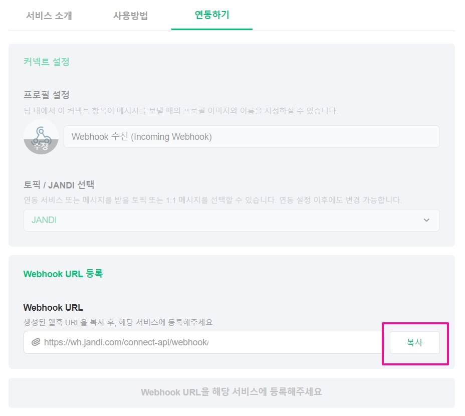 1-3) Webhook URL [복사하기] 버튼을 클릭해 메모해 주세요. (*설정 시 Webhook url 필요)