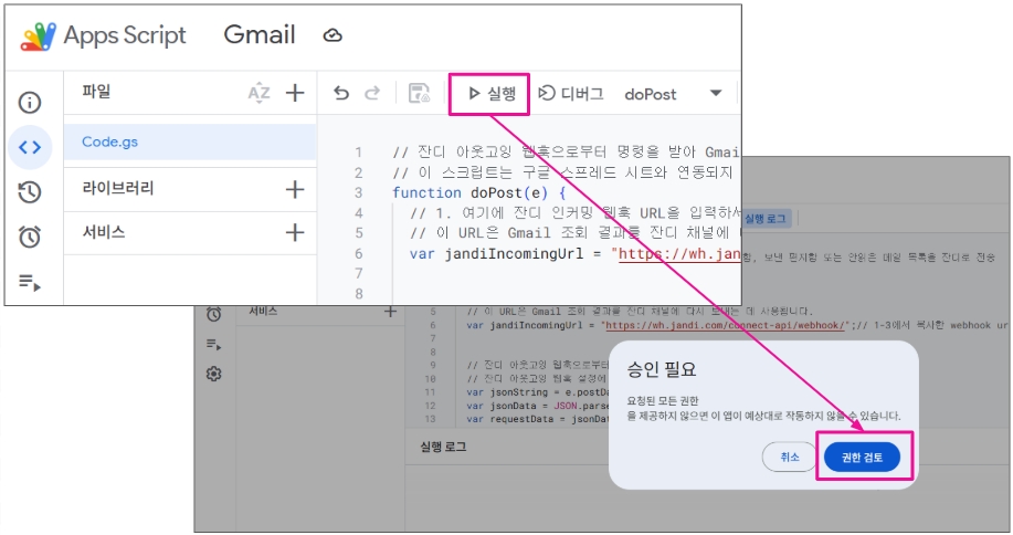 3-4) [실행] 버튼을 누른 후, 승인 필요 [권한 검토] 를 진행해주세요.