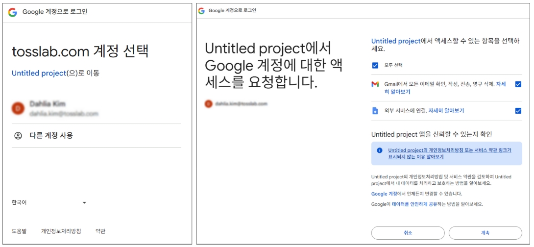 3-5) 구글 계정을 선택한 후, 구글 계정에 엑세스를 [허용] 해주세요.