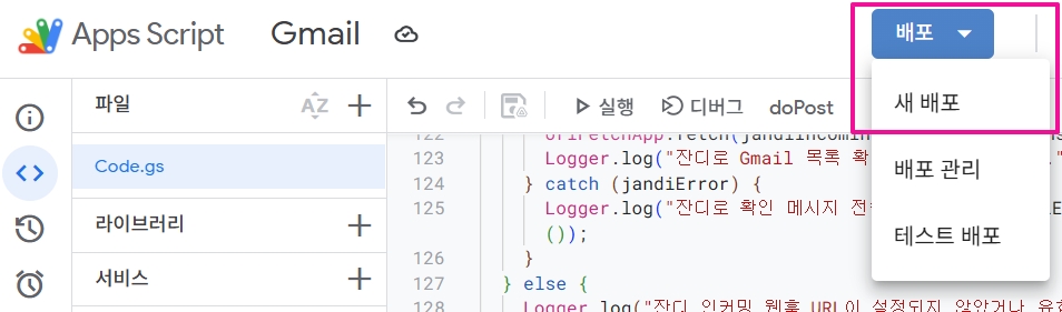 3-6) 스크립트 우측 상단 [배포] > [새 배포]를 눌러주세요.
