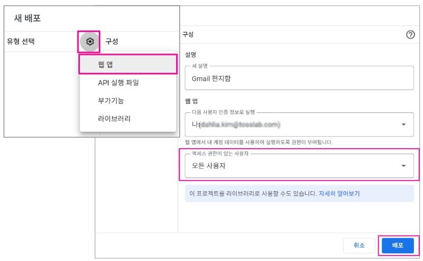 3-7) 새 배포 창에서 유형 선택 옆 [톱니바퀴] > [웹 앱]을 선택해 주세요.