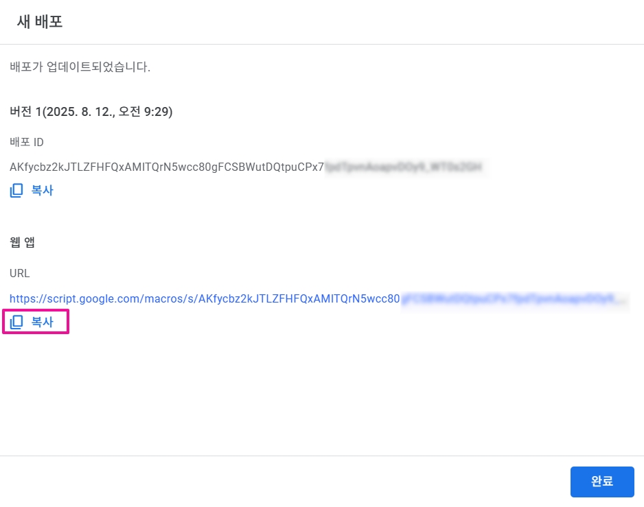 3-8) 웹 앱의 URL을 복사한 후 [완료] 버튼을 눌러주세요! (*Outgoing Webhook 설정 시 Webhook Url필요)
