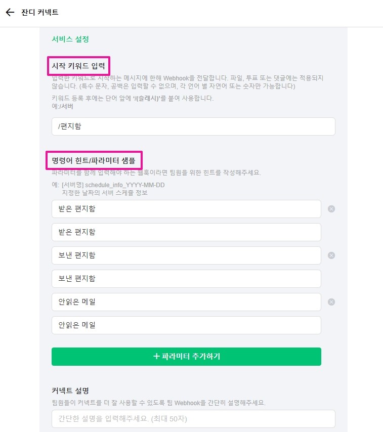 ② [파라미터 값]과 [파라미터 설명] 부분에 각 항목을 입력해 주세요. ex) 받은 편지함, 보낸 편지함, 안읽은 메일