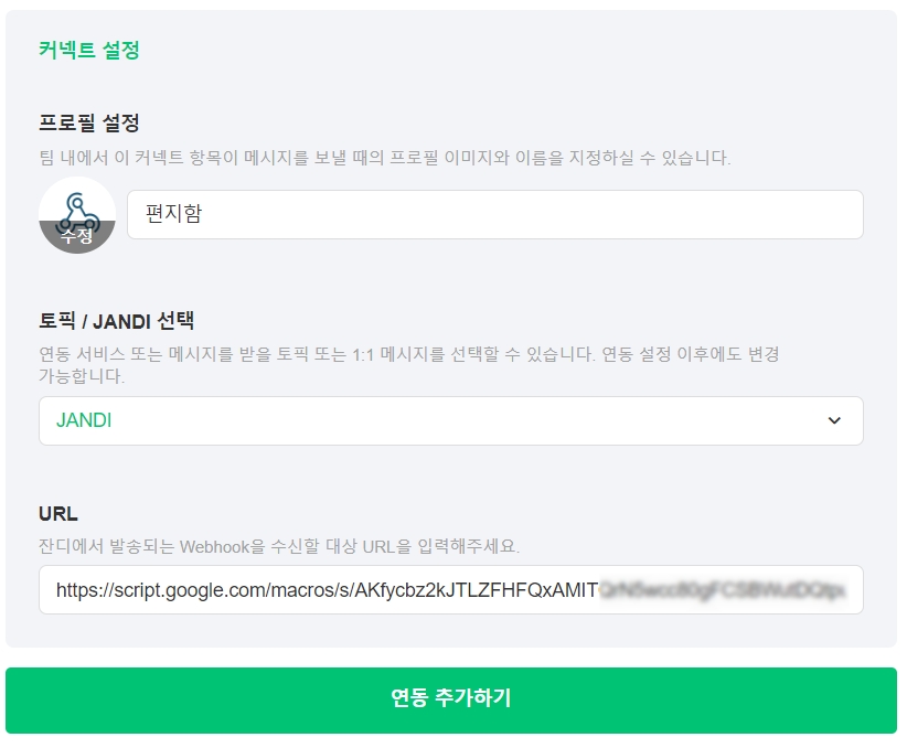 4) 잔디 커넥트 Outgoing Webhook 생성