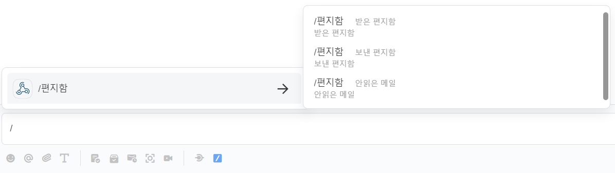 잔디 outgoing webhook을 활용하여, 받은 편지함 / 보낸 편지함 / 안 읽은 메일 3가지의 항목을 입력시