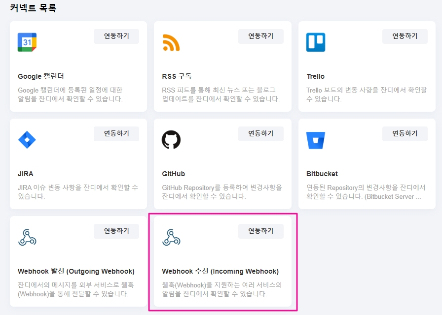 3-2)[Webhook 수신 (Outgoing Webhook)]의 [연동하기] 버튼을 클릭해 주세요.