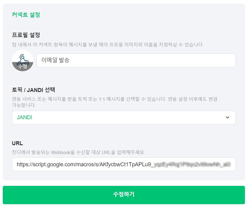 3) 잔디 커넥트 Outgoing Webhook 생성