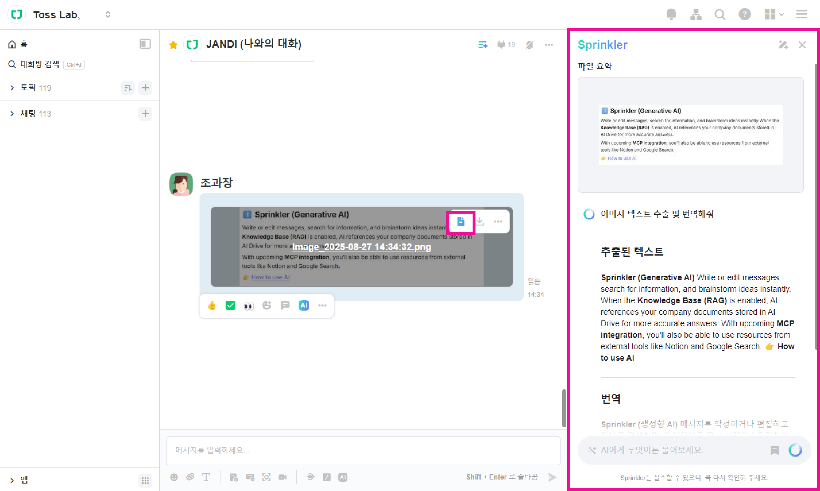 첨부 된 파일을 마우스 호버하여 [파일 요약] 아이콘 클릭 > 파일 분석 및 텍스트 추출, 번역이 가능합니다.
