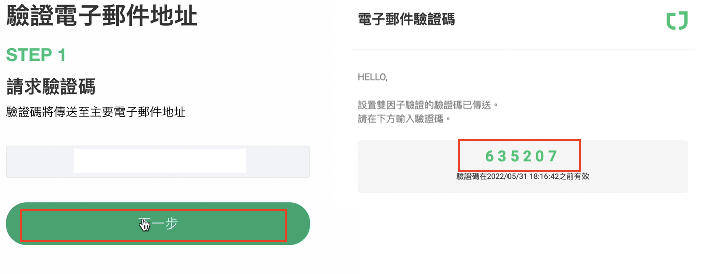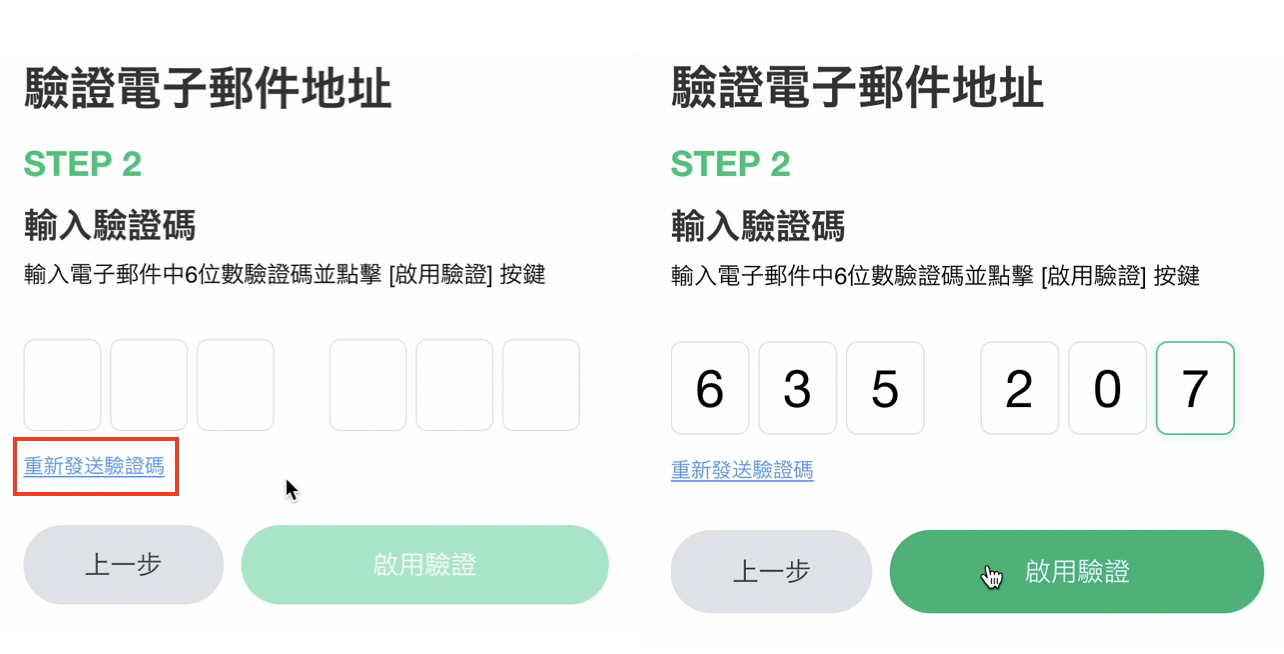 - 驗證碼只在發送後的五分鐘內有效,如果超過時間還沒輸入的話,請點擊『重發驗證碼』按鈕,新的驗證碼將會重新透過電子郵件發送。