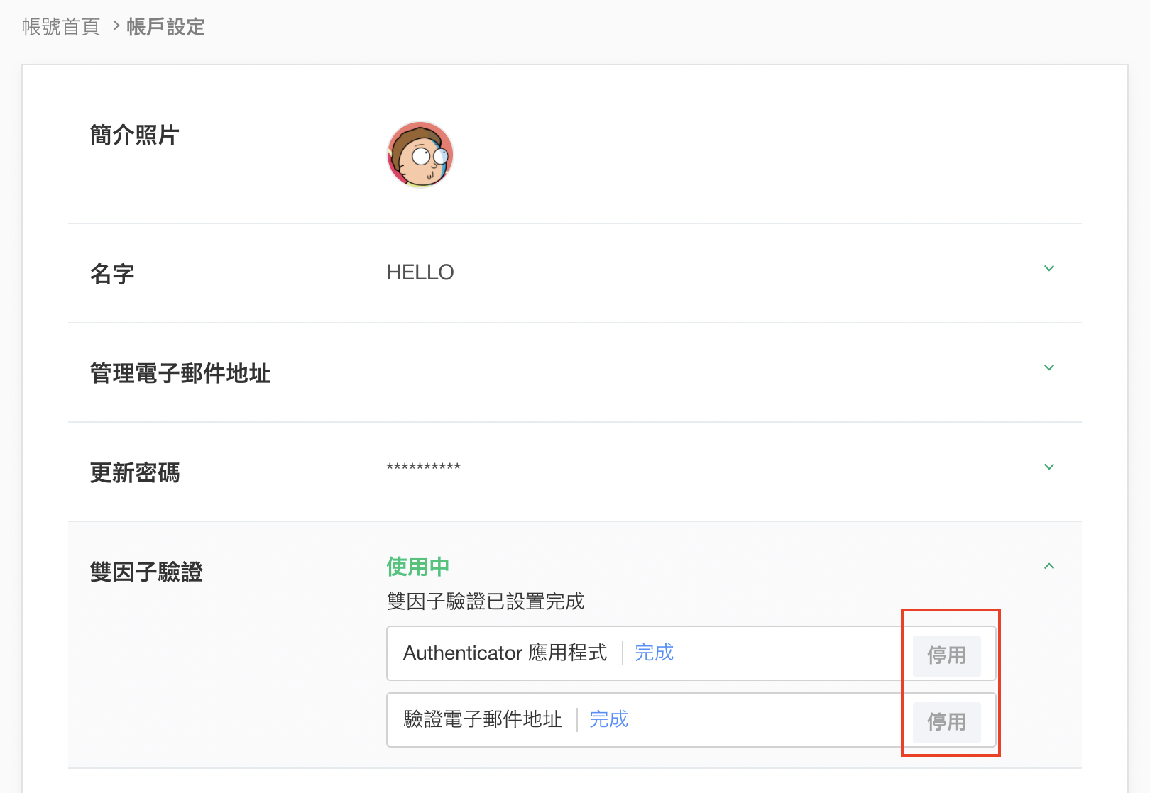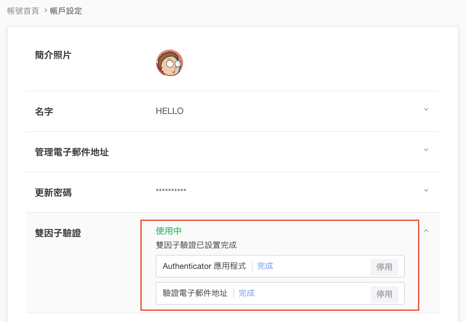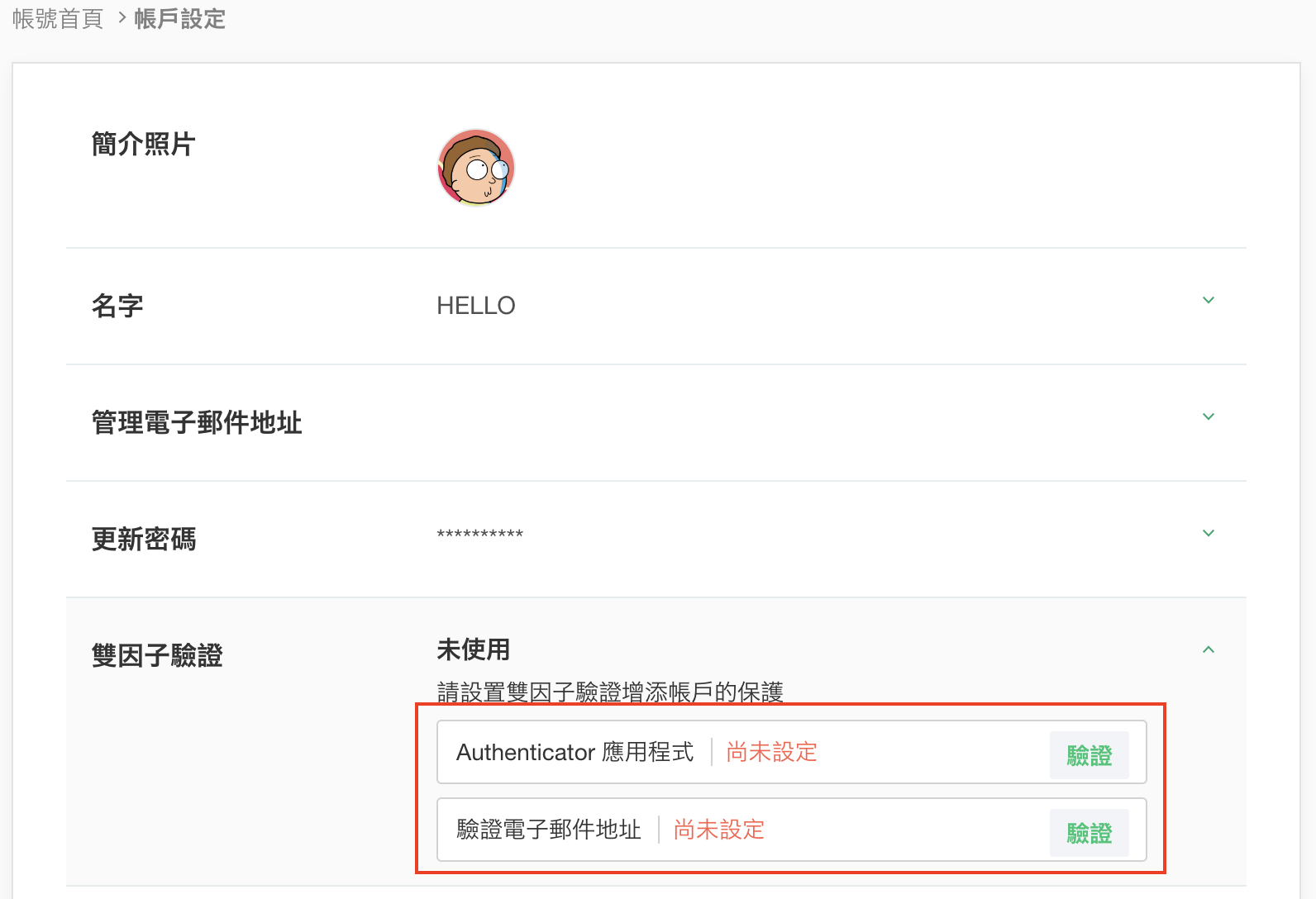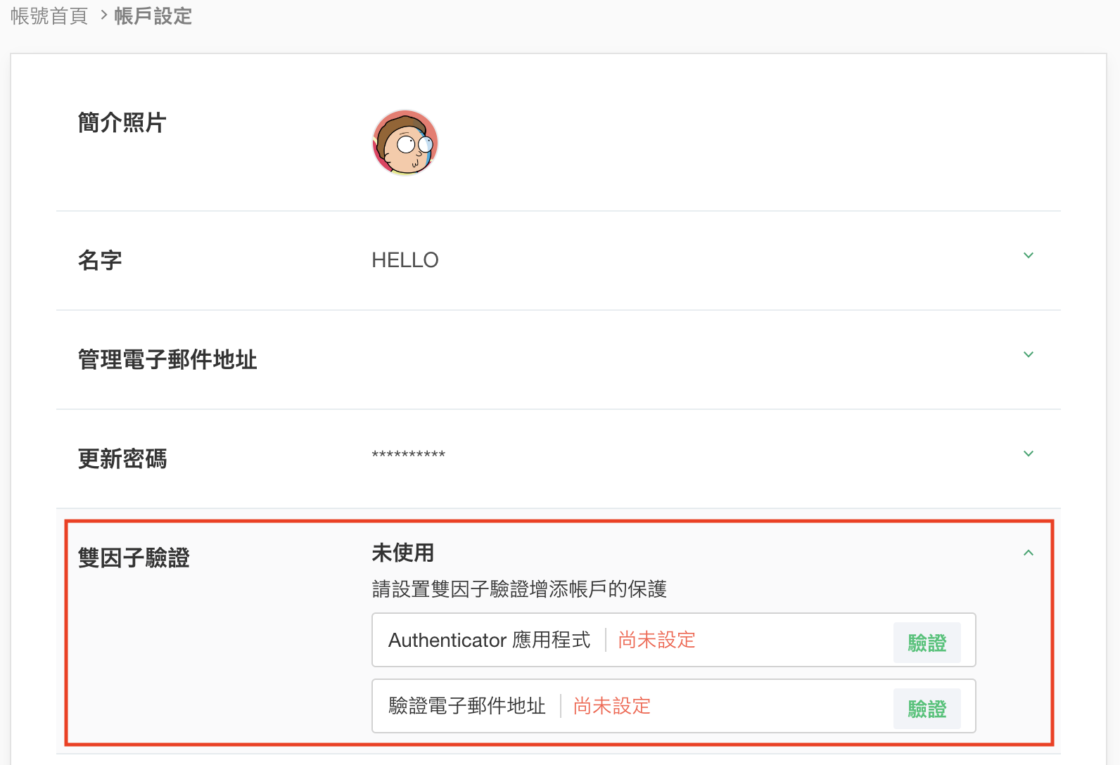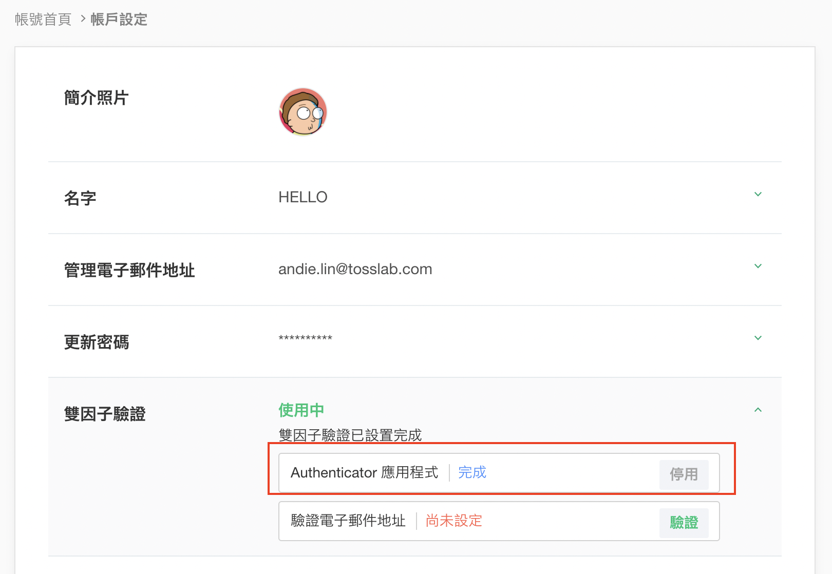 - 您可以在『帳戶設定』中確認是否完成雙因子驗證。