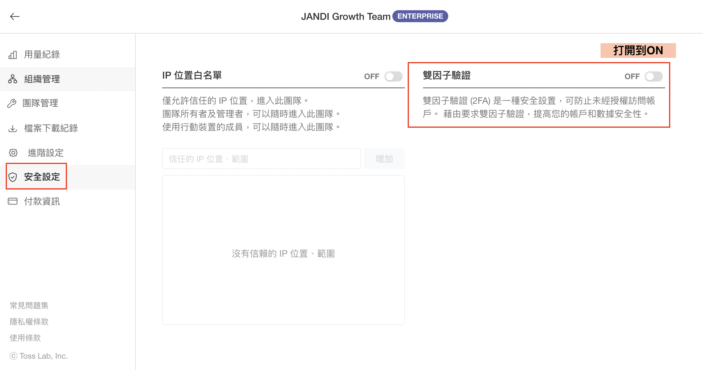 - 把雙因子驗證打開之後,尚未設置雙因子驗證的團隊成員,將會被自動登出團隊。
