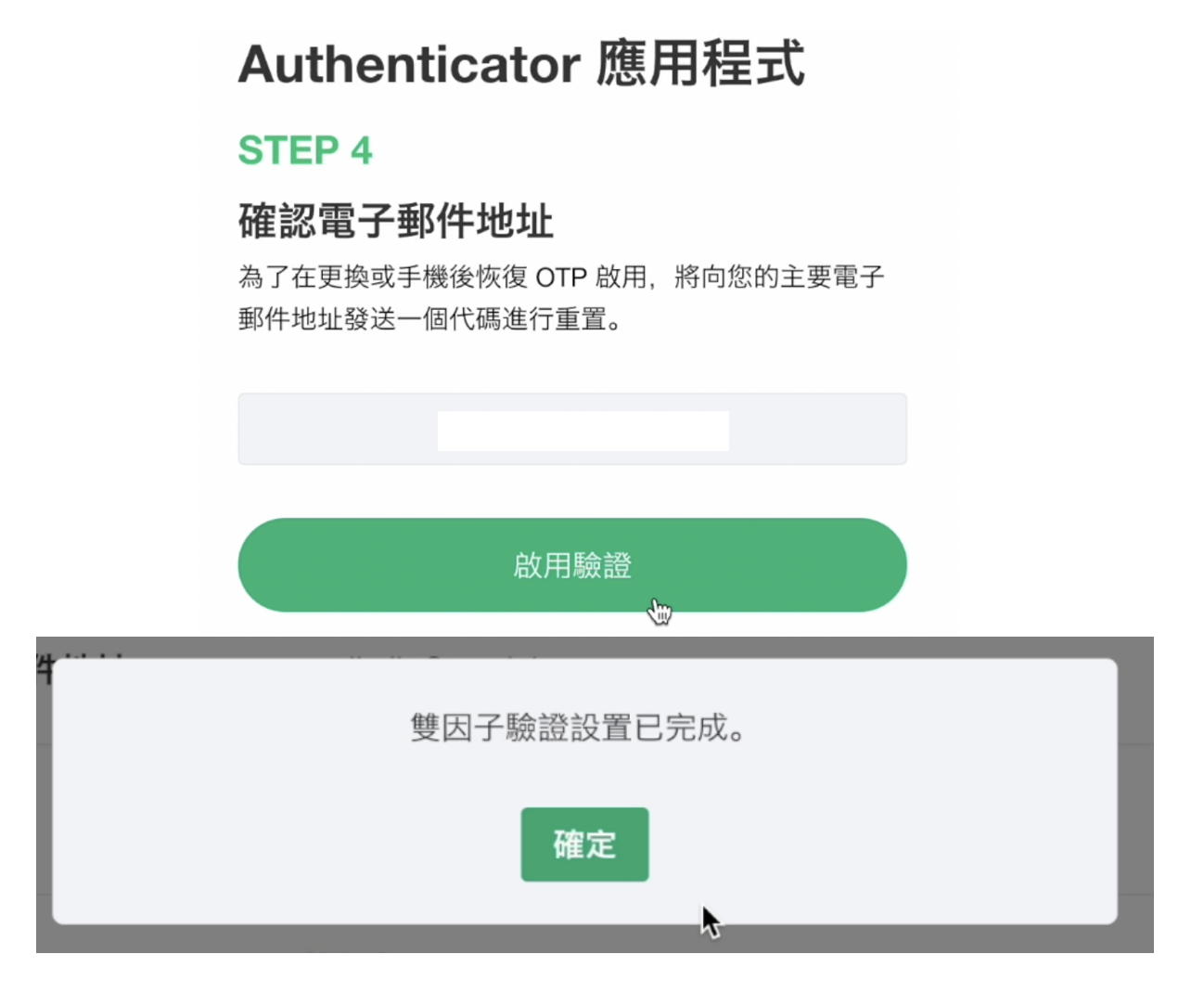 - 輸入從電子郵件中獲得的驗證碼 >點擊驗證按鈕後,您將會看到一個彈出視窗通知您雙因子驗證已完成,也可以透過電子郵件確認是否完成雙因子驗證。