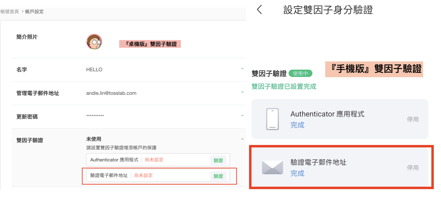 - 只要在應用程式(OTP)驗證或是電子郵件驗證中選擇一種方式驗證,就可以使用雙因子驗證功能。