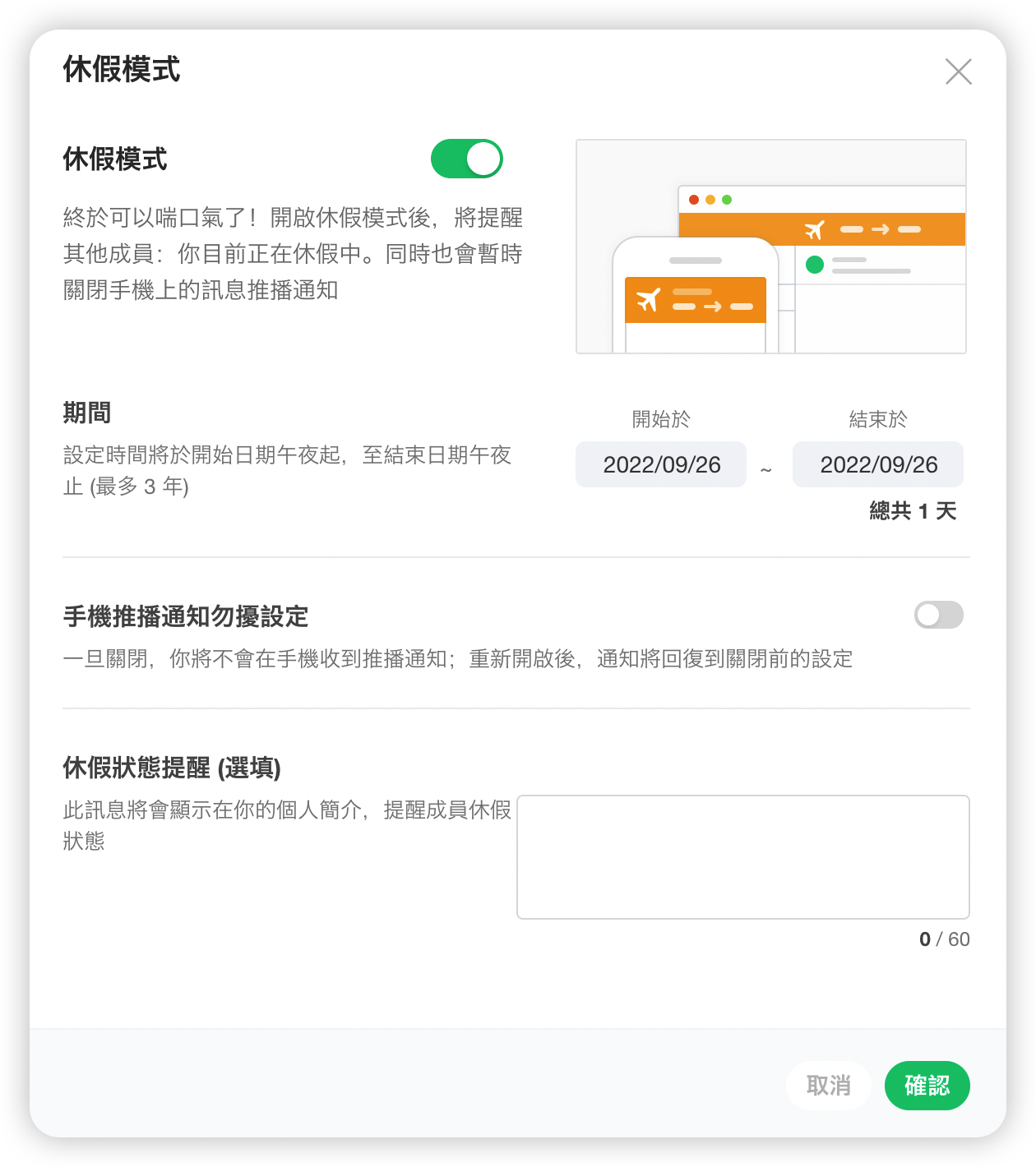 建議方法,有的人會在前三天就在 LINE 的大頭照換成文字公告,說明自己幾號到幾號休假,這個時間點不方便回覆訊息。因此其他人在發訊息的時候就會去點大頭照,知道當事人的休假期限。