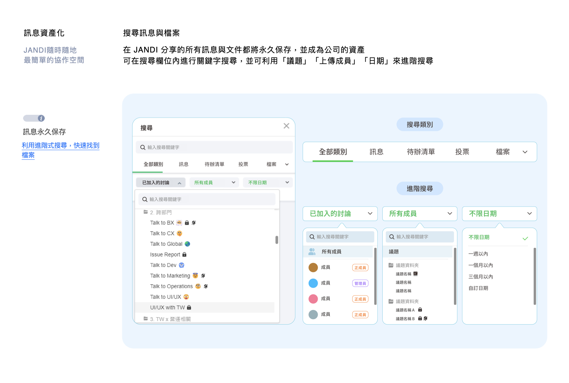 而且比起 LINE,JANDI 也不用擔心檔案會過期,或是遇到換手機以前對話就消失的慘況。對照 Email,JANDI 私訊也不用擔心因來回溝通次數增加,難以找到前面信件的內容。
