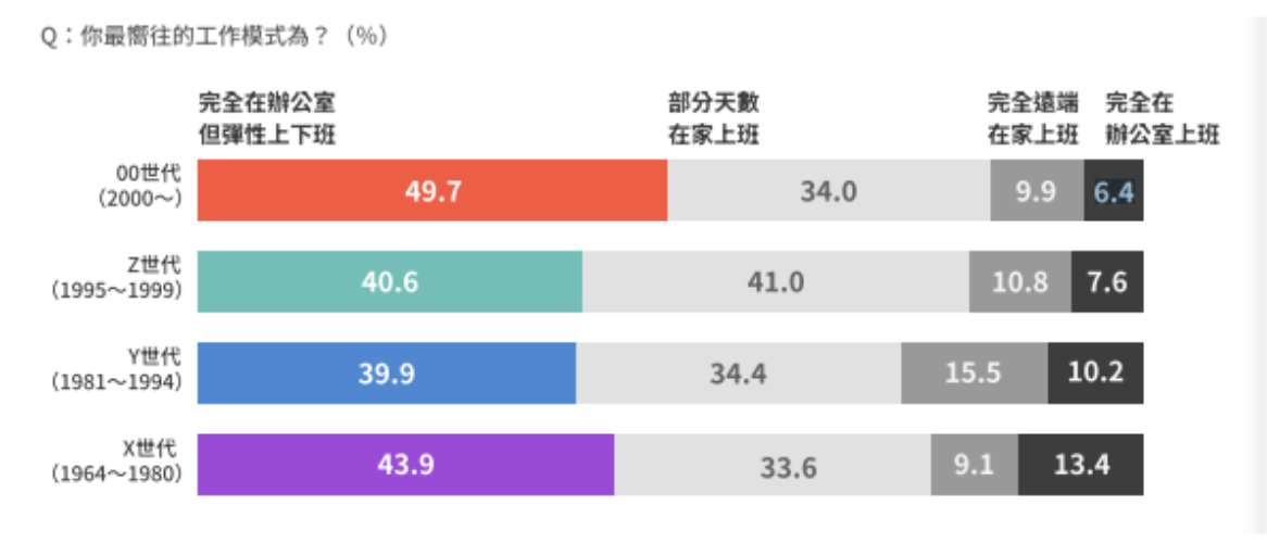 能否彈性上下班,確實是影響新世代工作者的入職意願。例如《 2023 00世代職場價值觀調查報告》顯示,00 世代有 49.7% 期望能完全在辦公室但彈性上下班。如果少了彈性,只剩 6.4% 願意完全在辦公室工作,同時這個數字比其他世代都還要「低」。