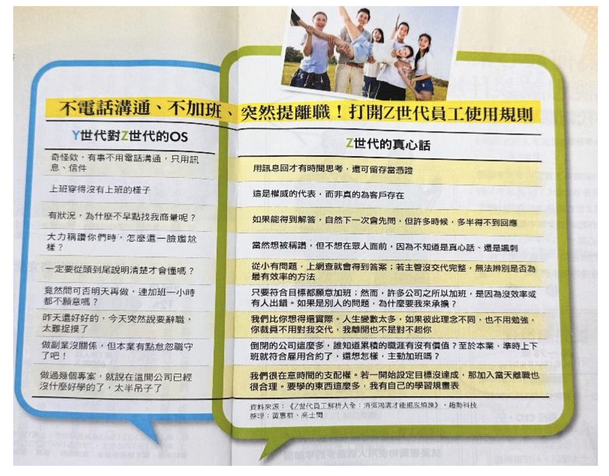 我們嘗試從調查報告及商業雜誌的質化調查,拼湊出Z世代對工作的心態。《商業周刊》第 1898 期「上有大老闆、下有小 Boss」一文提到,數位原生世代重視扁平化組織、希望實現自我價值,看待企業角度更傾向用「合夥關係」,如果雇主要求 Z 世代以全職形式且每天要進辦公室,有 16% 的受訪者表示會立刻離職找新工作。