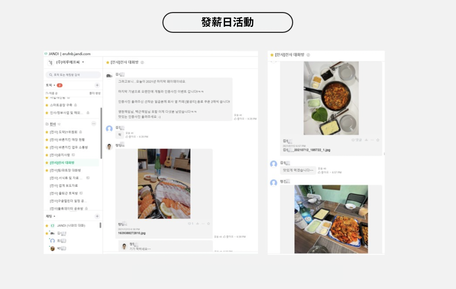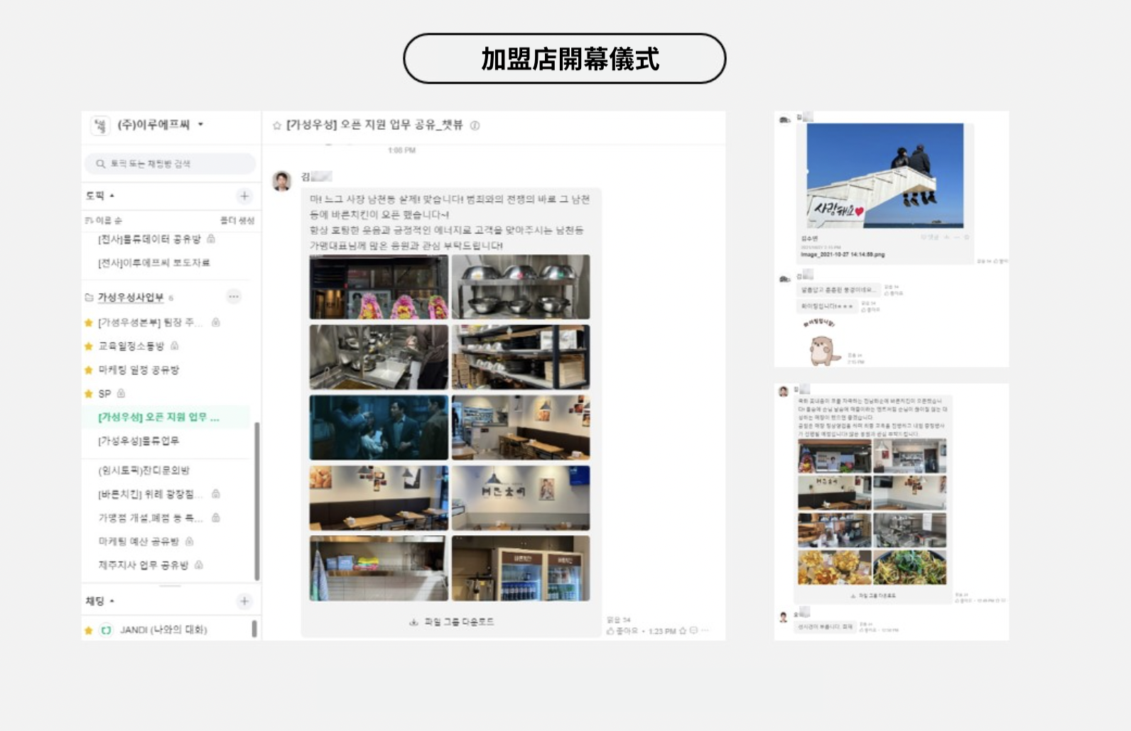 對於連鎖企業而言,開設加盟店是所有員工共同努力後的成果。我們公司會利用 JANDI 中的議題來分享加盟店開幕現場的照片和影片。辦公室裡的內勤人員也會向加盟主們表達祝賀,以及鼓勵在現場舉辦活動辛苦的公司同仁們。