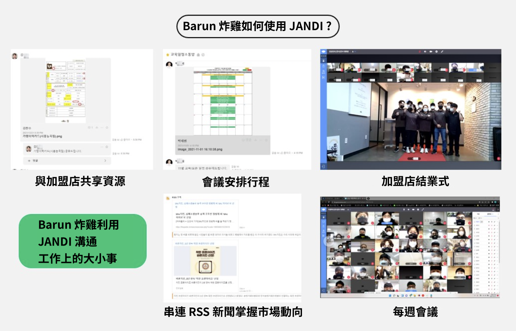 Barun 炸雞對新加盟店的教育訓練長達五天,從早上九點到晚上九點。因為是必須通過艱難地的進修與測驗後才能授予的結業資格,所以我認為結業式的意義非常重大。在新冠肺炎之前,公司的員工們都會參加祝賀新加盟店的的活動。但是,為了降低感染新冠肺炎,我們開始把線下的結業式改辦成線上的視訊結業式。感謝 JANDI ,因為 JANDI 的視訊功能,即使相距遙遠,我們還是能為活動劃下完美句點。
