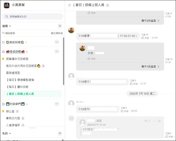 餐飲業者多半會聘用正職人員及工讀生,黑鬍子牛排的各家門市店長在 JANDI 成立「報班」議題,公告隔日上班人員名字及工作時數,同仁完成工作後也能回到議題回報確認。事後管理部門在發放薪資之前,可以到議題內利用搜尋功能,查找每位同仁名字確認上班時數,進而與雲端打卡系統的數據核對,確保工時、薪資的正確性。