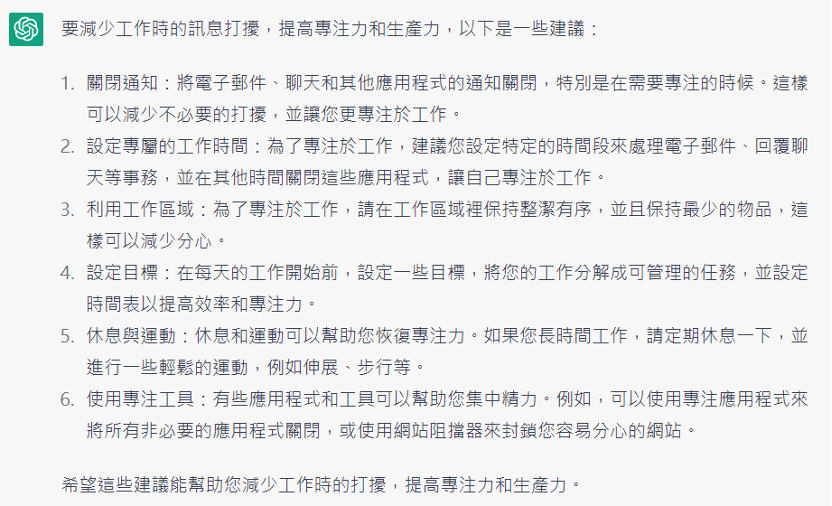 例如詢問「如何減少工作時有訊息的打擾,提升專注力及生產力?」