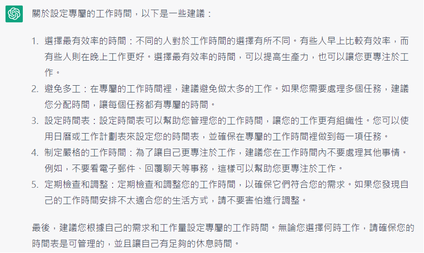 例如我們針對「設定專屬的工作時間」這個答案,再問 ChatGPT 有沒有推薦的時段及作法?