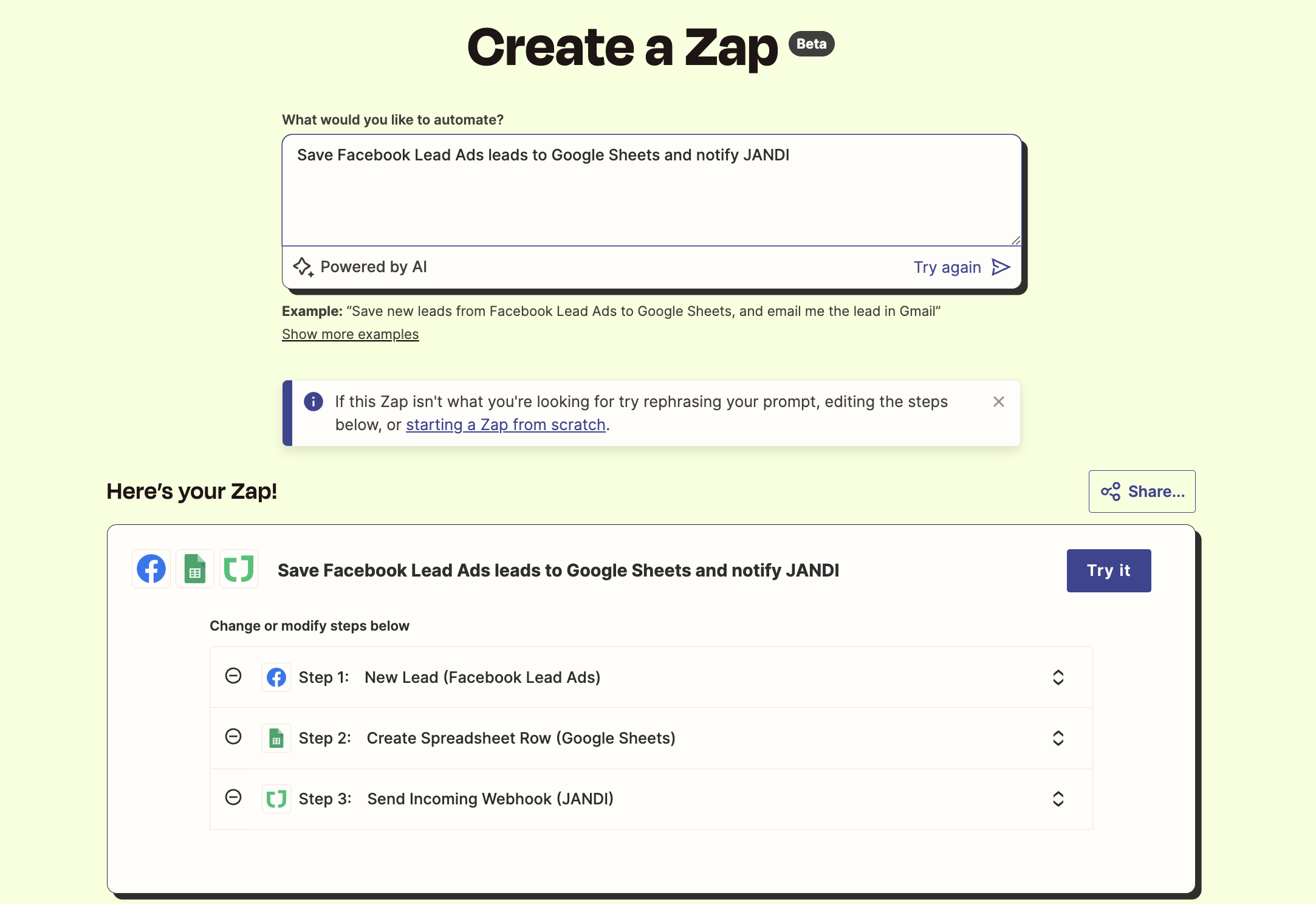 例如給予的指令是:Save Facebook Lead Ads leads to Google Sheets and notify JANDI,這時候 Zapier 的 AI 模型就會知道,未來 Facebook 名單型廣告(Lead Ads)有更新潛在顧客的資料時候,Zapier 就會即時在 Google Sheets 匯出原始資料,並且在 JANDI 上跳出通知訊息。等於人力不用再定期手動匯出名單,跳轉頁面整理資料,而是可以一邊工作,等待機器人做完前製作業後的通知。