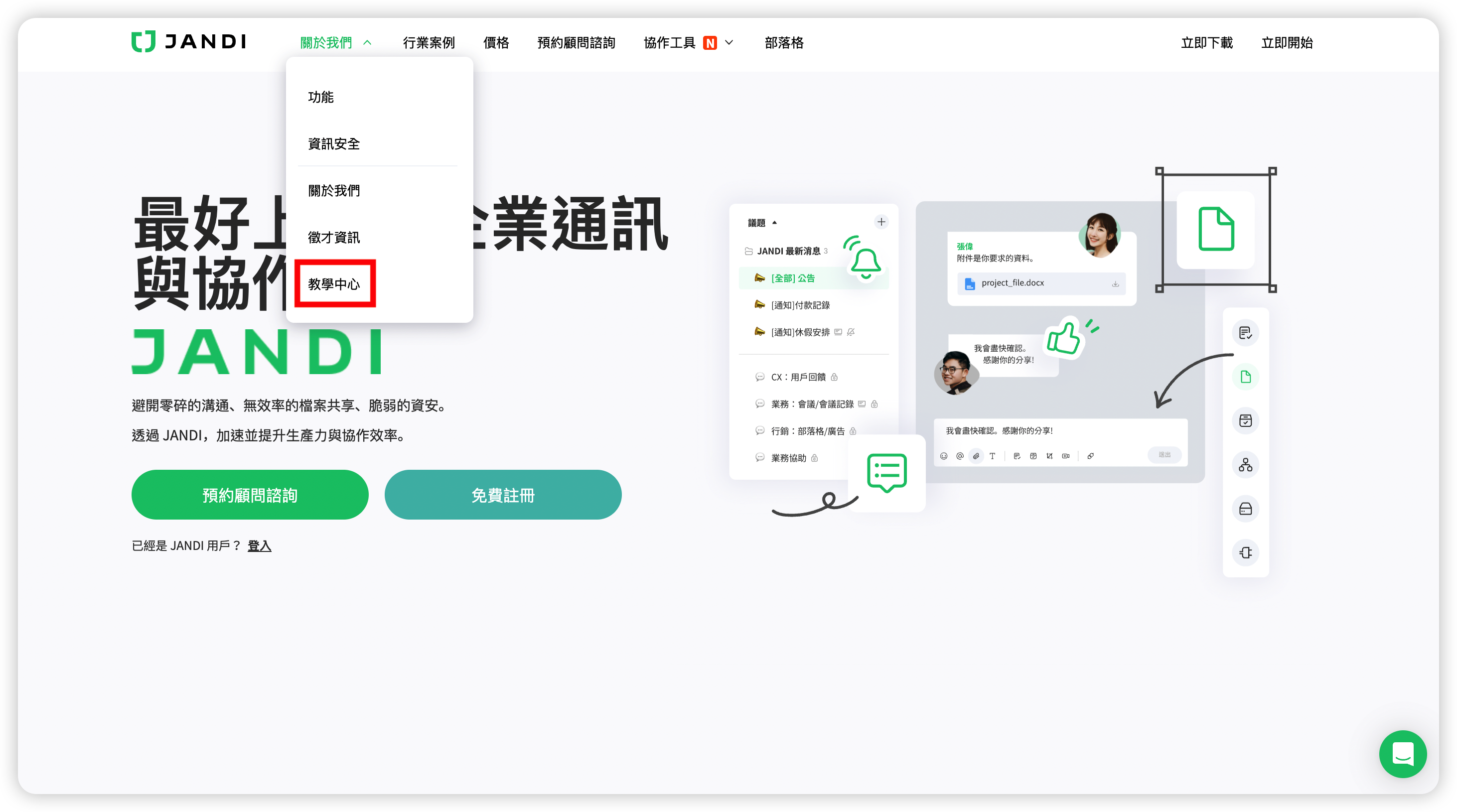 上述提到的幾項功能,如果 JANDI 用戶還不清楚該怎麼操作,或是自己摸索卻總是遇到問題,JANDI 有提供三種管道可以幫助用戶快速上手,讓所有客服成員一起無障礙使用 JANDI 。
