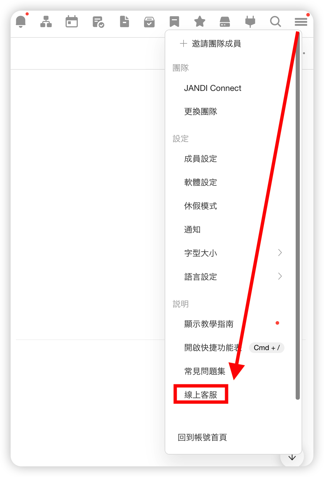 若您對功能不熟悉或是操作上遇到問題,想透過線上客服直接詢問,也可以喔!除了在未登入狀態到 JANDI 官網 右下角找到線上客服外,在登入 JANDI 後也可以在 [≡] > 線上客服 (電腦版) / […] 更多 > 線上客服 (手機版),點開後,選擇 [傳訊息給我們],JANDI 線上客服將盡快協助解決問題。