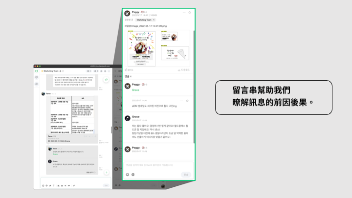 針對個別訊息留言可以變成留言串的功能被選為大家的最愛。事實上,JANDI 有非常多好用的功能,很難只挑出一個最愛的功能。由於企業成長得非常快,員工們的角色和職缺內容也變化得非常快。這個時候,我們都會在以前討論過的留言串裡面標記@新成員的名字,讓他們能夠透過留言串的歷史紀錄來瞭解之討論過的訊息。