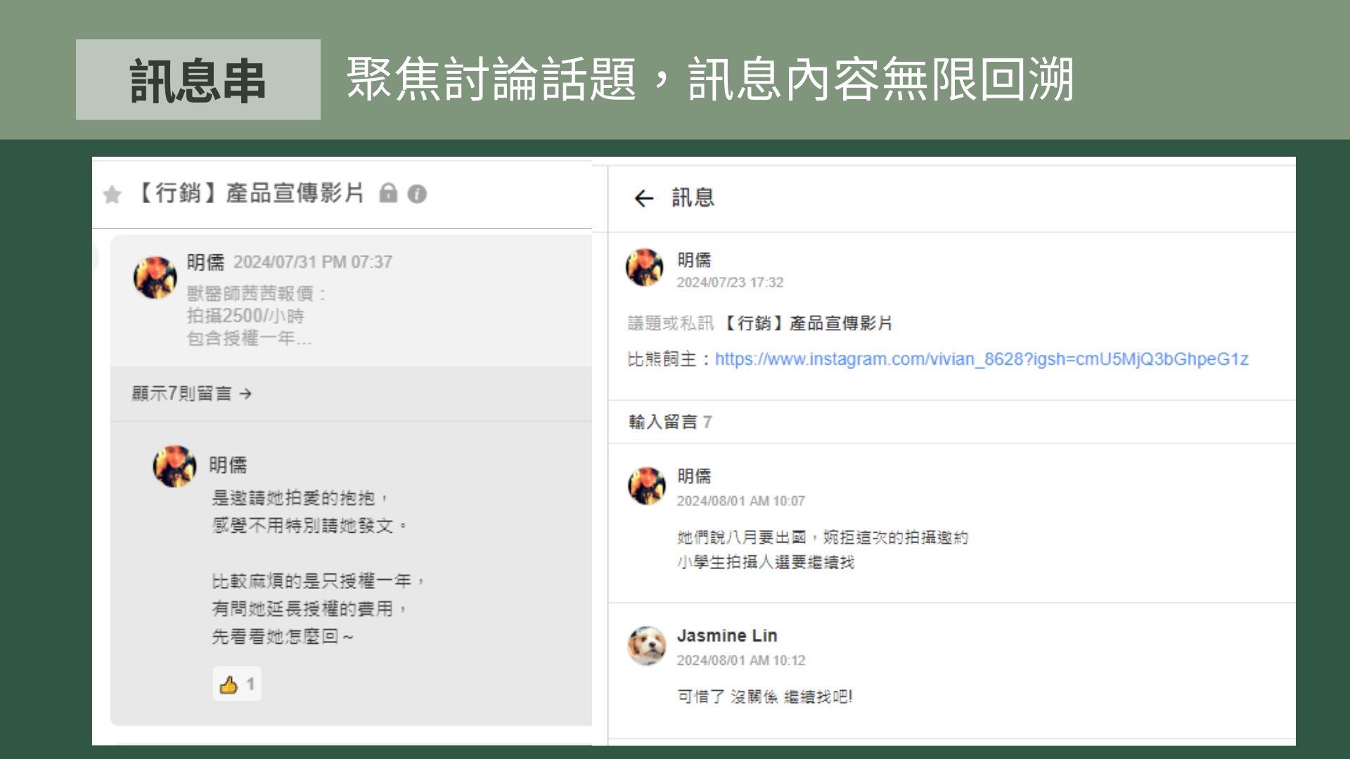 你的企業在溝通協作是否遇過以下情境:通訊軟體群組不斷增長,訊息四散各群組容易遺漏,大家在討論事情時總是不夠即時,讓專案進展緩慢;又或是檔案分屬不同平台,每當要協作或對焦公事就要在不同平台來回切換,因為缺乏系統性,無法有效整合文件和溝通常常會遺漏重要信息,造成訊息孤島,大幅影響工作效率。