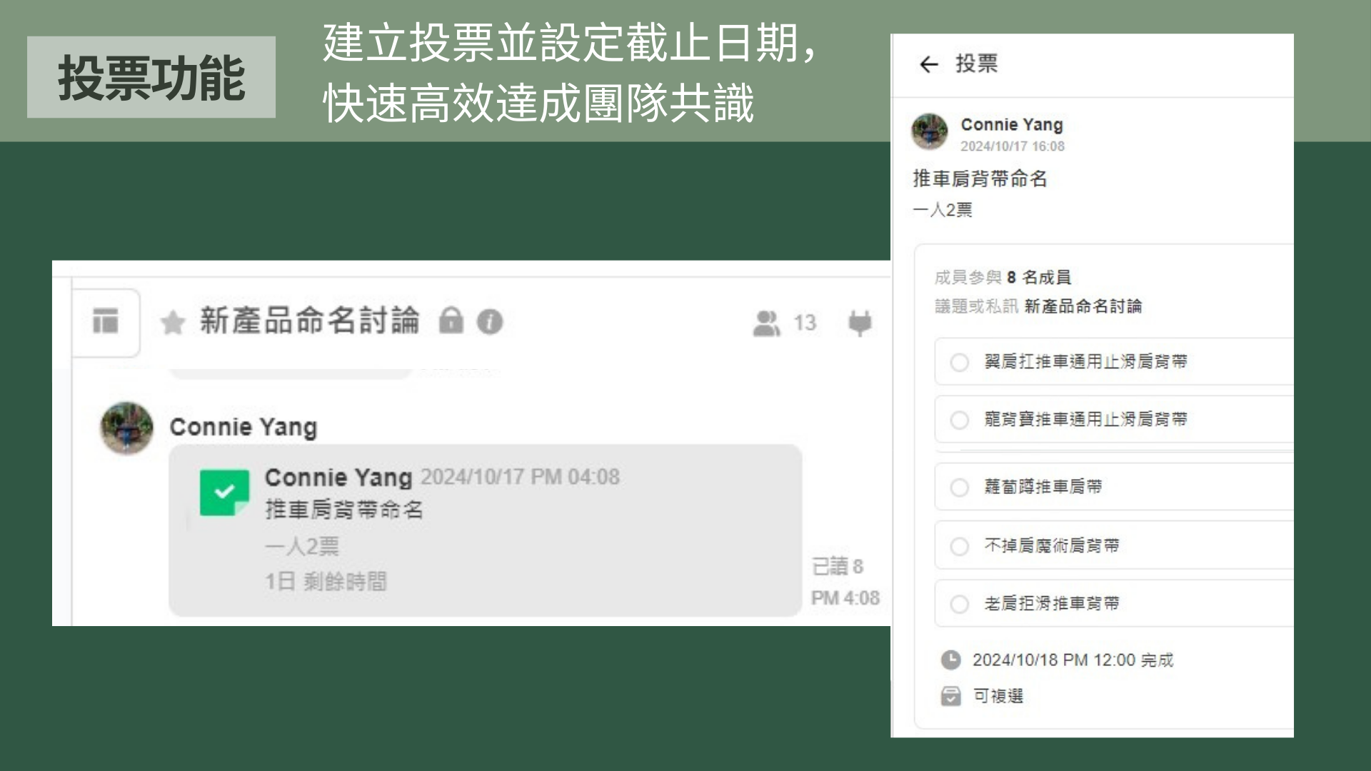 ibiyaya 觀察現在日常的工作內容,有高達80%是在 JANDI 平台上達成,其中有幾項功能深受團隊歡迎,有助於加速工作進度。其一是「投票」,過去 ibiyaya 開發新產品要命名或決定商品配色,各方不同意見難以整合,現在藉由 JANDI 投票功能,就能在一天內取得共識。