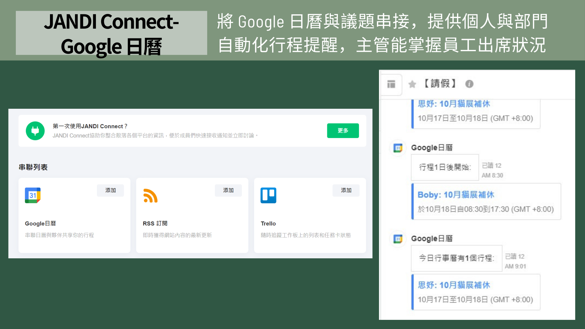 而 JANDI Connect 串接 Google 日曆的功能,讓 Abby 可以在每周一的時候從 JANDI 收到自動通知的訊息,知道這一個禮拜有哪些同事預先請假,以及請假的時間天數,讓管理者輕鬆掌握同仁的出缺席。對員工來說,同事也能知道彼此請假日期,能提早安排職務代理或交接任務,確保工作進度沒有斷點。