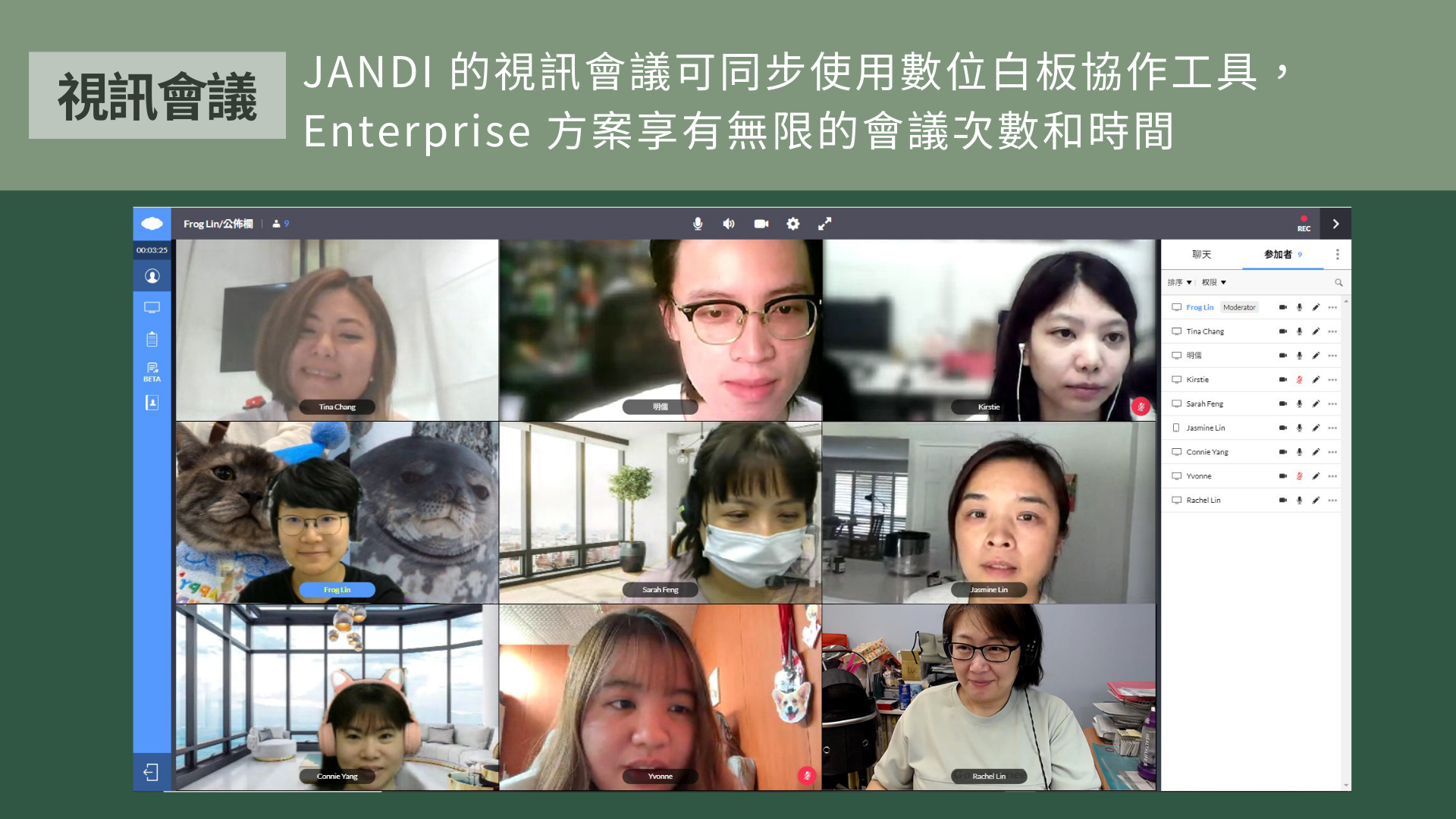 Ibiyaya 大量使用到 JANDI Enterprise 版本的功能之一「視訊會議」,除了沒有會議次數和時間的限制,加上 JANDI 的視訊會議有數位白板協作工具,有助於同事一邊開會一邊標記影音素材內容,提升會議效率。