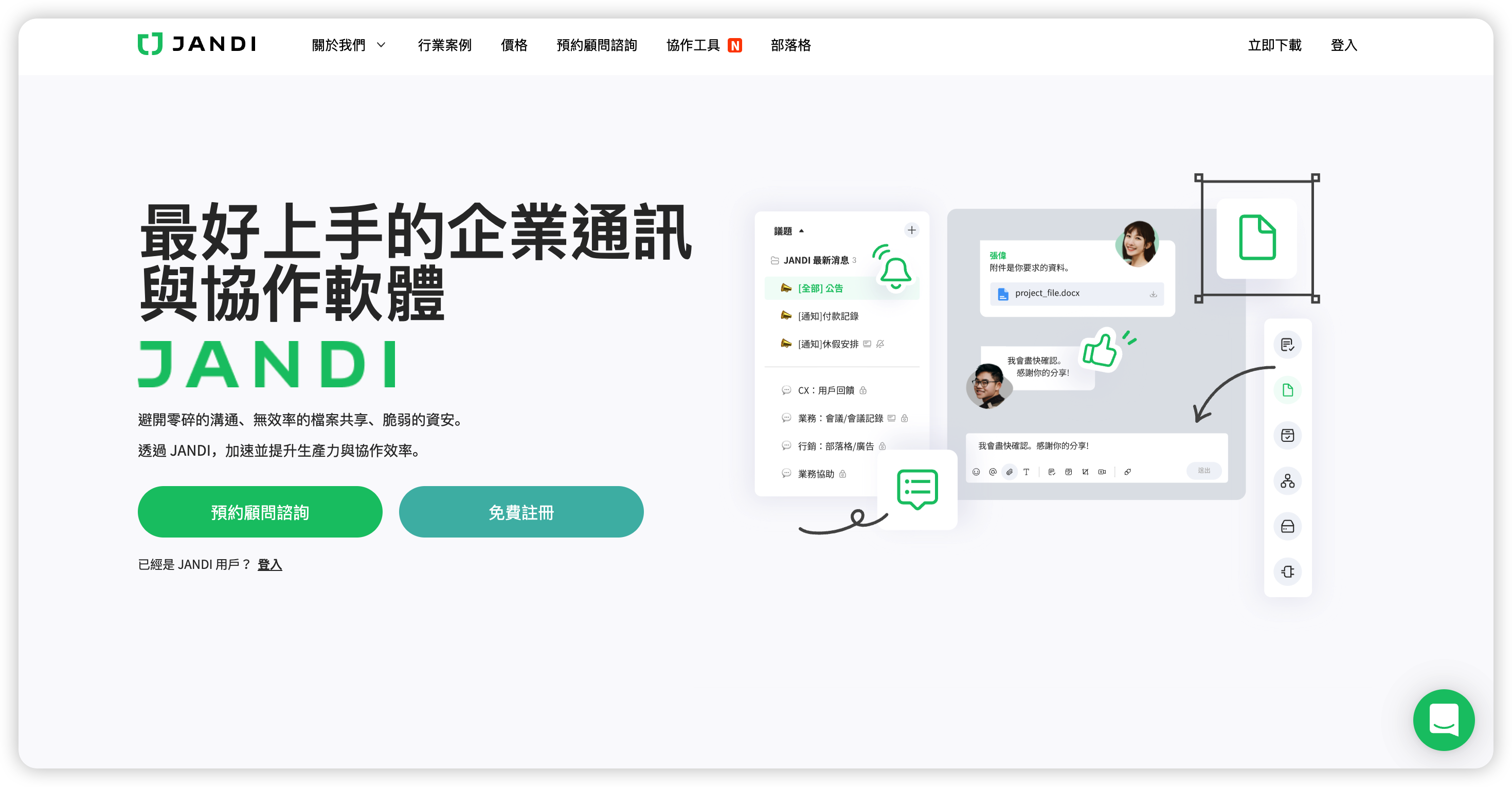 用一句話來形容 JANDI 的話,它是『一個可以協助你提高工作效率的工具』。有著像通訊軟體一樣簡單的使用性、提供即時溝通、能針對不同主題建立議題聊天室、線上會議、檔案永久儲存以及能串聯外部工具等線上協作所須的功能,從而提高工作生產效率。企業在引進 JANDI 後開始將資料資產化,員工們也能將公事與私生活分離,只在 JANDI 裡與同事溝通討論工作,提高工作效率。