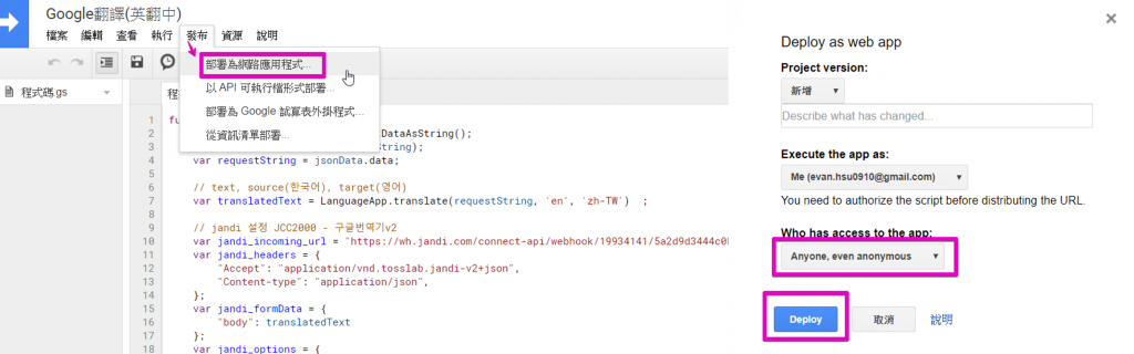 -URL(粉紅框):將 2-3-2的「Current web app URL」貼上。