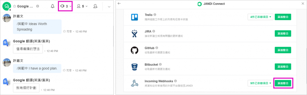 不需要任何的工程背景,只需利用 JANDI Connect 中的「Incoming Webhook、Outgoing Webhook」來串聯 Google 翻譯,就可以直接完成站內翻譯。過程不到 10 分鐘!