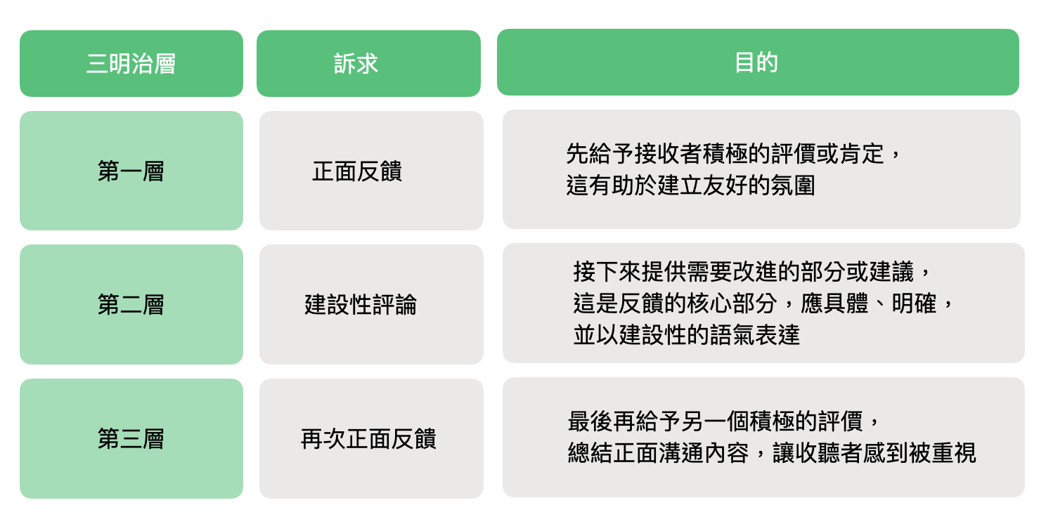 既然中階主管被夾在中層,要向上管理又要向下領導,躲不過溝通協作的情境下,那就更要善用「三明治溝通法」,用這套方法來對應上面的主管與下面的部屬。究竟什麼是三明治溝通法?簡單來說,就是把將批評或建議夾在兩層正面評價中間,就像三明治的夾層一樣,目的讓聽者更容易接受,減少對方的負面情緒反饋。