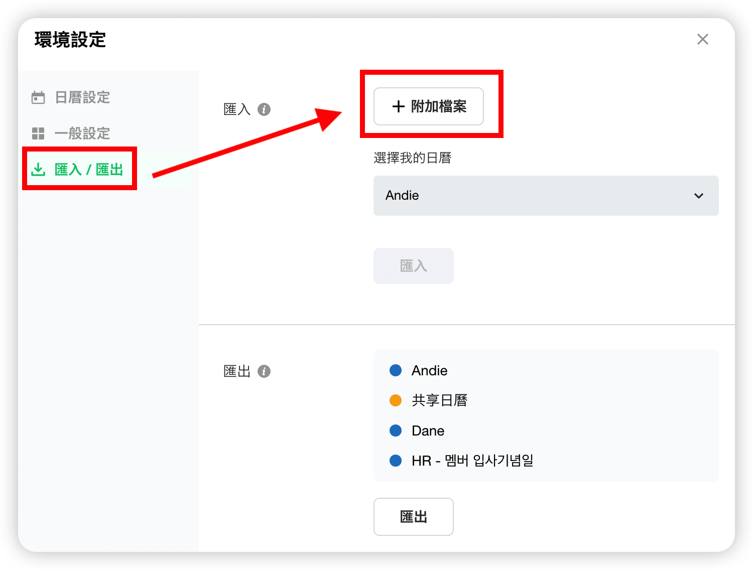 • 『環境設定』->『匯入/匯出』-> 選擇『附加檔案』