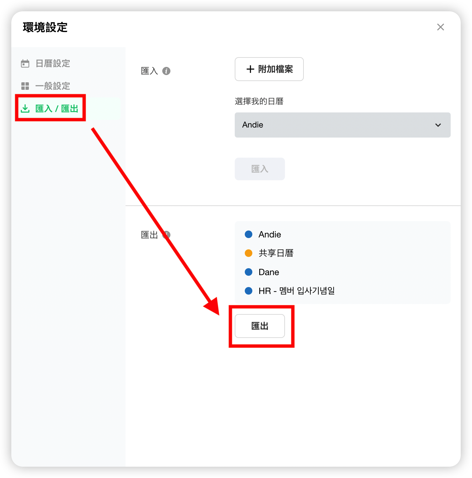 • 『環境設定』->『匯入/匯出』-> 選擇『匯出』