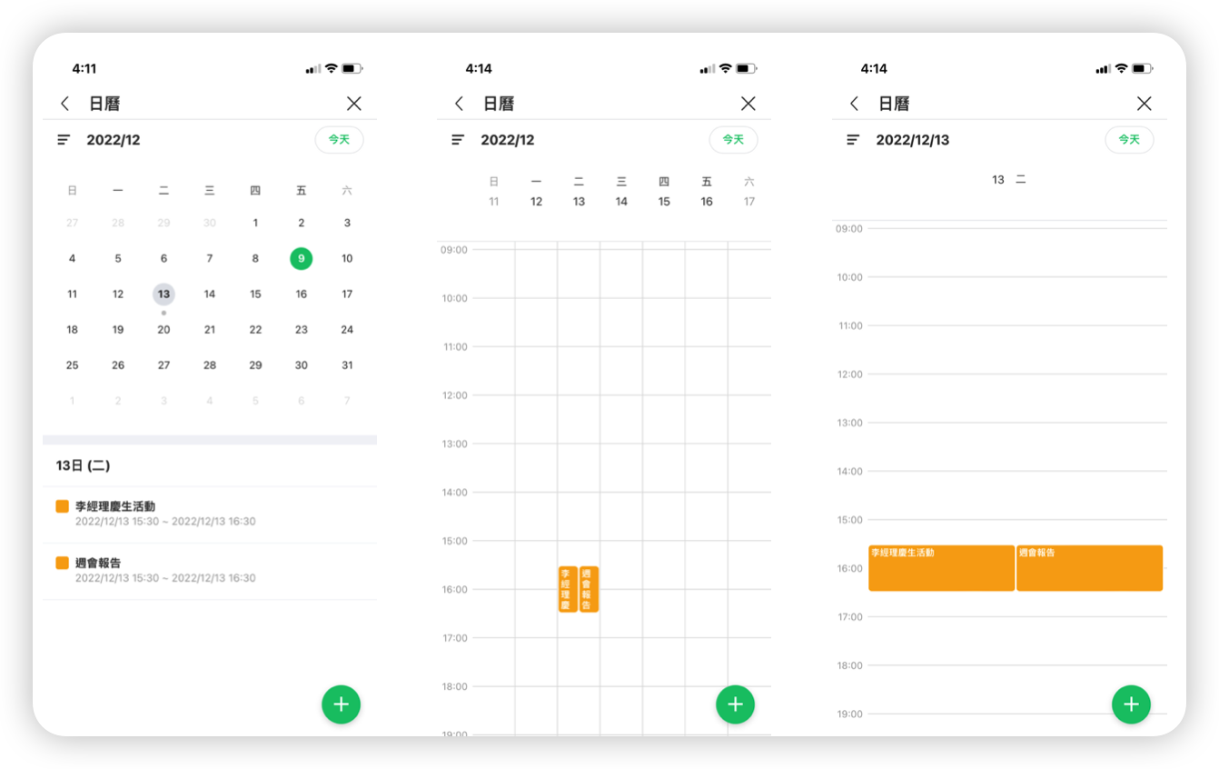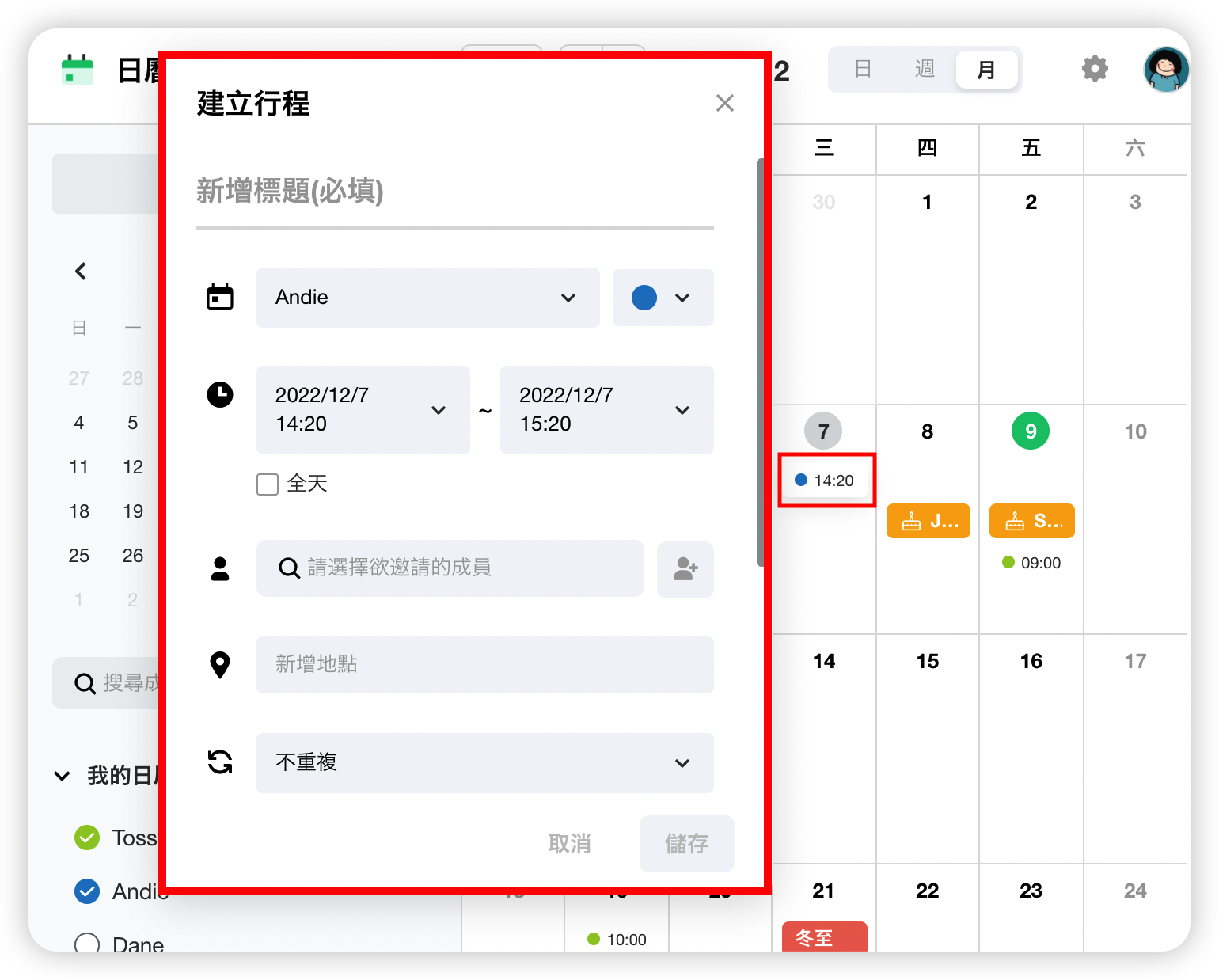 • 直接在日曆上點選日期 -> 輸入必填資訊,例如標題和日期 -> 按下『儲存』