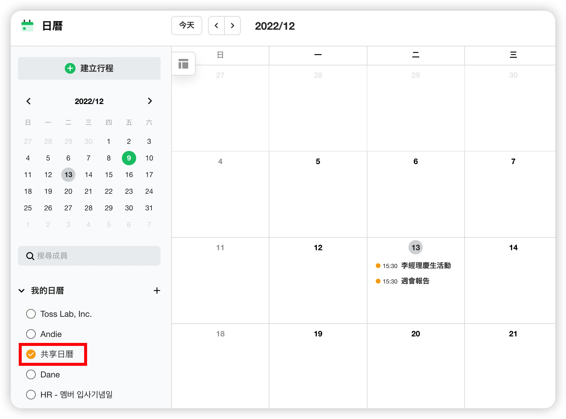 • 如果您在新日曆建立行程的話,那麼行程就會與邀請的團隊成員分享。